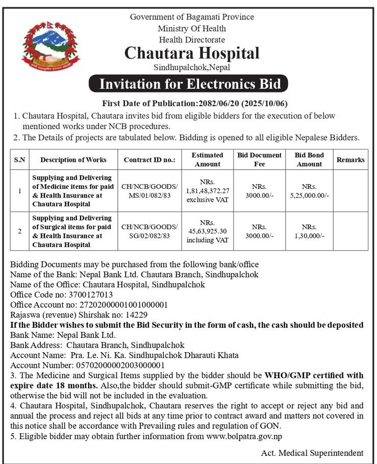 अस्पतालको लागि आवश्यक औषधी तथा औषधी जन्य सामाग्रीहरु र सर्जिकलका सामाग्रीहरुको शिलवन्दी दरभाउ पत्र सम्वन्धी सूचना