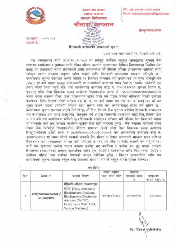 अस्पतालको लागि आवश्यक औषधी तथा औषधी जन्य सामाग्रीहरु र सर्जिकलका सामाग्रीहरुको शिलवन्दी दरभाउ पत्र सम्वन्धी सूचना